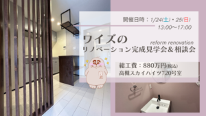 ワイズのリノベーション完成見学会&相談会~高槻スカイハイツ720号室 1/24(土)・25(日)13:00~17:00 リフォーム・リノベーションのご相談だけでもOK!この機会にぜひお越しください! 現地にてお待ちしております!(高槻スカイハイツ720号室 高槻市古曽部町2丁目10-10)